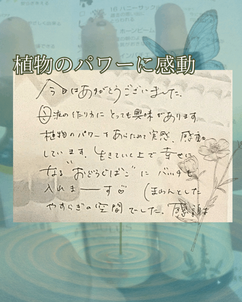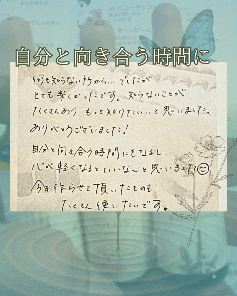 含まれる内容:アロマで深呼吸/ノートワーク/バッチフラワーブレンド作成